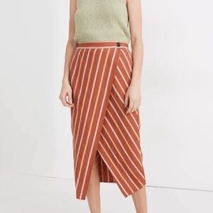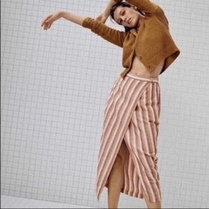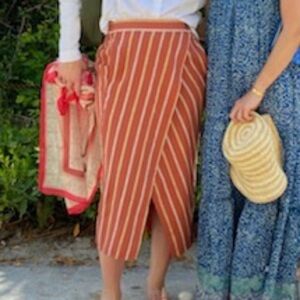 Made of an airy linen blend, this striped pull-on midi has a wrap shape with two buttons at the (elastic) waist. Easy to wear and endlessly pretty, it's essentially a sunny day in the form of a skirt. Linen/cotton. Machine wash.