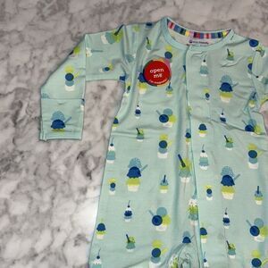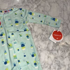 Adorable Magnetic Me kids one piece in a playful blue and green pattern. Easy magnetic closure for quick changes. Perfect for your little one's comfort and style.