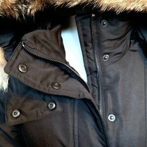 DOWN-FILLED PARKA WITH DETACHABLE NATURAL COYOTE TRIMMED HOOD. THIS STYLE COMES IN A TWILL FABRIC AND THE INTERIOR LINING IS CHANNEL QUILTED IN A CIRE FINISH FABRIC. ZIP FRONT CLOSURE WITH A ZIG-ZAG STITCHED PLACKET THAT HAS METAL SNAP CLOSURES.
