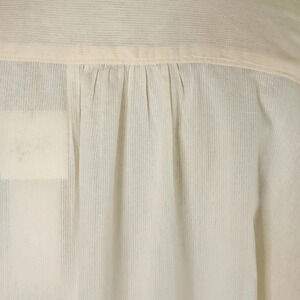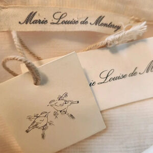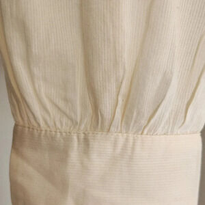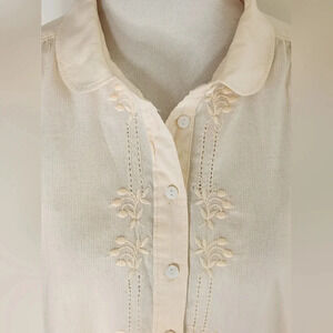 This blouse is a beautiful piece by Marie Louise de Monterey in size 12. The fabric is very fine with tiny pinstripes. Along edges of the button placket is feminine floral embroidery and tiny eyelet detailing. Along shoulders, wrists and and on back of blouse is delicate gathering along a double hem. The collar is rounded. I would say the color is vanilla. This brand is Australian and quite pricey. Each shirt is between $300-400 a piece.