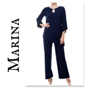 Be a woman of style and exquisiteness in this Marina 268398 creation. This jumpsuit has a unique asymmetric tiered hem design on the waist, with quarter-length sleeves and beaded trim along the scoop neckline. The keyhole cutout at the front and back exudes contemporary charm. It is tailored from matte jersey fabric, and finishes in a straight pant design that keeps it elegant and comfortable. Orchestrate your moment to turn heads in this Marina 268398 style. Model is wearing Navy color.