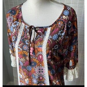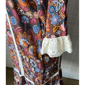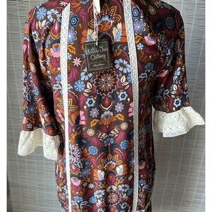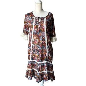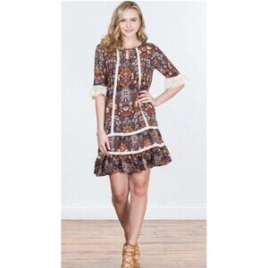 The NWT Matilda Jane Intermission Dress in brown and white lace floral is a stylish shift dress perfect for casual occasions. Featuring 3/4 flared sleeves, a round neckline, and made from rayon lace fabric, this midi dress exudes a 60s vintage vibe. The small size and multicolor floral print add a boho touch to the overall look, making it a versatile and trendy addition to any woman's wardrobe.
