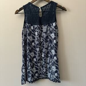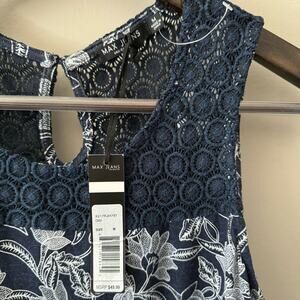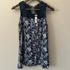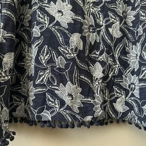 NWT MAX STUDIO NAVY FLORAL SLEEVELESS BLOUSE W/ POM POM FRINGE & CROCHET MED