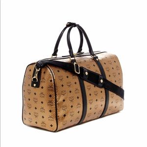 NWT Limited Edition MCM Metallic Gold and Black Weekend Duffle. Dual rolled top handles with buckle closer. Detectable and adjustable shoulder strap with MCM logo on shoulder. Top zip closure. Exterior features classic logo printed pebble construction, protective feet, luggage tag and solid trim. Interior features 3 slip pockets, 1 snap closure wall pocket and 1 zip wall pocket. Includes dust bag. 11.5”H x 19.5”W x 8.5”D. Ships out same or next business day. Five star seller, smoke free home!