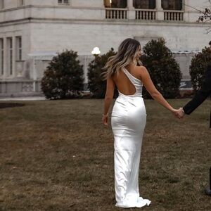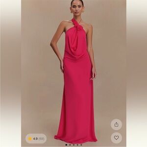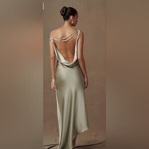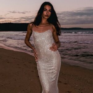 DESCRIPTION Halter-ing reality.The BLAKELY is a sleeveless maxi dress with a deep cowl neckline, self-tie satin straps, and sequinned fabrication. A classic evening gown elevated with contemporary cuts and elements, Blakely is the perfect pick for a sultry winter vibe. Its soft, sequinned fabrication glimmers subtly like fresh, fallen snow. Its draped cut and combination of tight and loose material work harmoniously to create a fetching silhouette. Self-tie satin straps at the neck and back add a simple but captivating design. Pair with a dainty satin clutch and elegant heels, like the Fleur Thin Strap Ankle Heel. FEATURES Across back strap is adjustable with adjusters Custom sequin Satin ties Asymmetric seam line Back cowl Lined Maxi length FABRIC & CARE Main: 95% Nylon, 5% Elastane Lining: 95% Polyester, 5% Elastane Wash Care: cold hand wash separately if needed, do not soak or wring, do not rub, do not bleach, do not tumble dry, dry flat in shade, do not iron, do not dry clean.