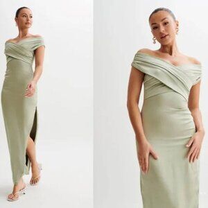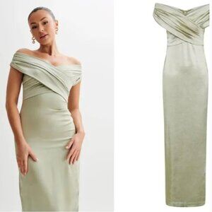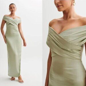 NWT MESHKI Harley Off The Shoulder Cross Satin Maxi Dress in Sage Green Size XS