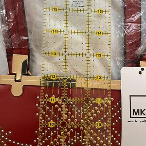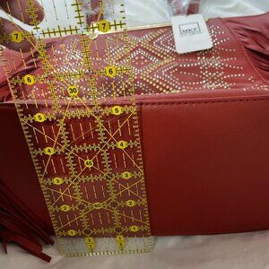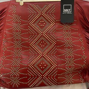 This is a New With Tags Large Womens Satchel Bag Purse from the MKF (Mia K. Collection). It has Western Fringe and a Southwestern Geometric Design on Red Faux Leather. Opposite outer side has a zippered pocket. The lining design is a leopard print, and the hardware is golden color. Concealed Carry pocket as well as other zippered and non-zippered compartment. Shoulder Strap is still sealed and will be in the bag itself. This bag is large and approximate measurements in photos.