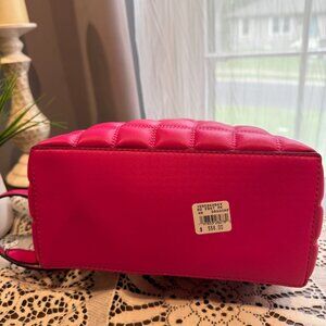 Elevate your accessory game with this Michael Kors backpack, featuring a vibrant Dragonfruit and a distinctive quilted design. Crafted from a glossy vegan material, it offers a modern and minimalist aesthetic. The silver tone hardware detail adds a touch of sophistication, making it a standout piece for any occasion.