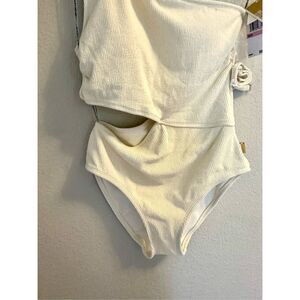 This Michael Kors one-shoulder swimsuit in a beautiful cream color is calling your name! With its chic side cut-out and a flattering ribbed texture, you'll be the undisputed queen of the beach or pool.