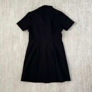A black short sleeve stretch shirtdress with gold-toned snap button design. Not lined. Hem likely falls above knees depending on height