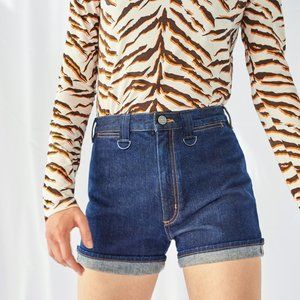 The Bay short is an exclusive style inspired by a 70s jean used in Vogue shoots and to style Chloe Sevigny. The denim has been simply rinsed so the contrast stitching and wide belt loops pop against the indigo. Added D rings at front belt loops give attitude. Recycled leather patch on the back pocket and hidden tiger print pocket.