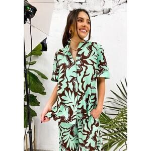 Crafted for the warm vibes of summer, the MINKPINK Kelani Shirt is a must-have for your wardrobe. The short sleeve design paired with a classic button-up neckline offers a relaxed yet chic look, perfect for beach days or casual outings. In a vibrant green hue, it captures the essence of Hawaiian themes with a contemporary edge.The shirt comes in a comfortable XS size, tailored to fit with a regular size type that ensures a flattering silhouette. Made from soft viscose material and featuring a down fabric type, it promises breathability and ease of movement throughout your summer adventures. Add a touch of MINKPINK's laid-back elegance to your collection with this stylish basic piece.