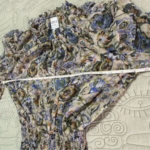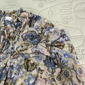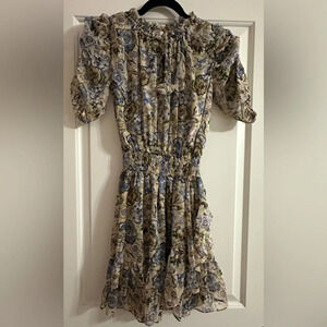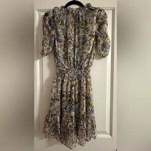 A smocked waist creates chic definition on this pretty floral minidress finished with a ruffle hem. 36 1/2" length (size medium) Split neck with ties Short sleeves 100% polyester Dry clean Made in the USA