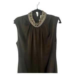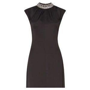 $385 New Retail. Your perfect Long Black Dress for this season and beyond. This new Kira dress is cut from a gorgeous black satin and hits at the flattering midi length. Sleeveless with a high neckline that is embellished with sparkling crystals for just the right amount of shine. Front center seam with a flattering gathered neckline. Hidden back zip closure. A timeless piece you'll have for years to come.