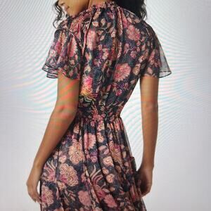 Be ready for the summer season with our beautiful Azura dress! Crafted from gorgeous navy and pink dotted floral chiffon, this midi silhouette is a must-have and features a smocked neckline, short flutter sleeves with a keyhole back closure, as well as a smocked waist and pocket details complemented by a ruffle trimmed skirt. Make a statement and show off your style! Waist stretches. This XXS will fit Xs or S
