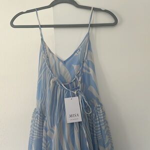 Beautiful Misa LA Bia Maxi dress. Baby blue wave print. Criss cross back with adjustable straps. Tiered ruffle maxi dress. Lined. Size XS but can fit to a size Small. Never worn. 100% Polyester.