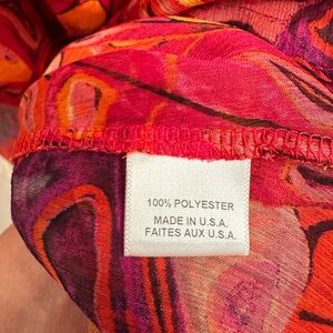 This Misa Los Angeles dress features a vibrant, colorful abstract pattern with a floral motif, predominantly in shades of red, orange, and purple. The design is an asymmetrical one-shoulder silhouette with layered ruffles that add movement and texture to the garment. The lightweight, sheer fabric flows elegantly, giving it a breezy, bohemian feel, perfect for warm-weather occasions. The high-low hemline further enhances the dynamic design, making it both playful and sophisticated.