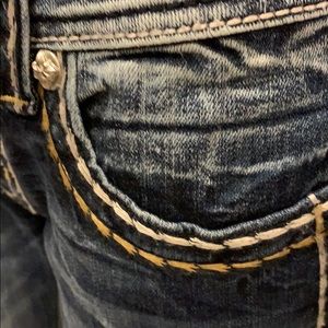 Gorgeous medium wash with tan and white stitching on these MISS ME BOOTCUT JEANS. They ROCK! Size 27
