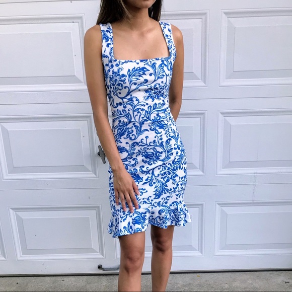 Blue and white, paisley print, trumpet dress with square neckline. Perfect for cocktail/formal dress and hugs your curves in all the right places.