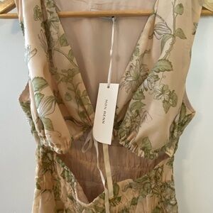 NWT Mon Renn tie front cutout bodice wildflower mini dress. Feminine and flirty coquette aesthetic. Great for special occasion, wedding, graduation, travel, vacation, honeymoon, resort. Lightweight, delicate, floral, beige/neutral tone dress.