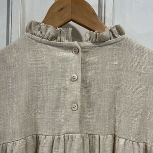 Beautifully simple and intricately textured linen featuring a high neckline with a simple ruffle of fabric at the neck