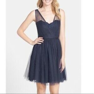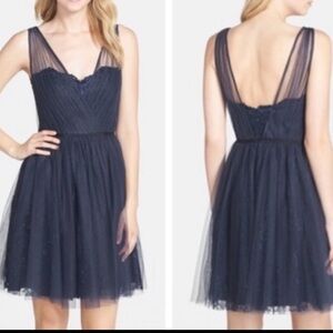 NWT MONIQUE LHUILLIER Dress Fit & Flare Dress Navy Tuelle Overlay Dress Size 16
