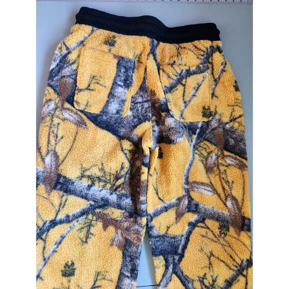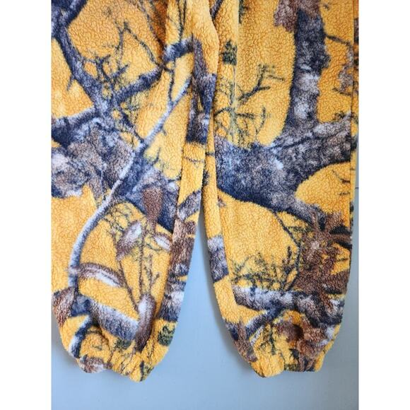 Polyester sherpa fleece lounge pants. Camouflage pattern printed throughout.