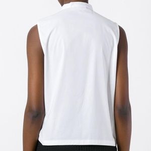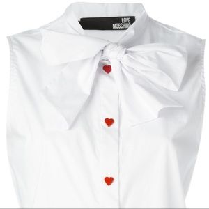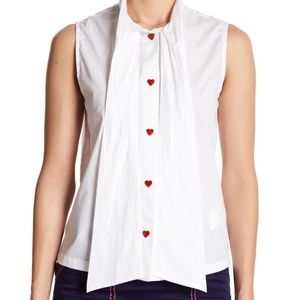 Brand new with tags. Crisp sleeveless white blouse with a pussy-bow neckline and heart shaped buttons