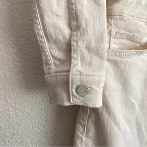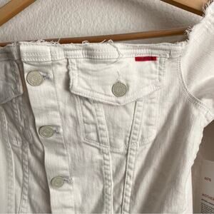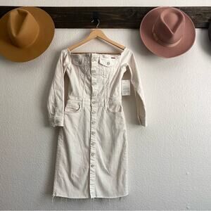 Cream denim Uncovered Knee Fray dress from the limited edition Mother x Carolyn Murphy collab. *Model and environmental advocate Carolyn Murphy's limited-edition 60% MOTHER capsule is an ode to Americana, using upcycled materials to reimagine the classics *This creamy, off-the-shoulder denim dress is reworked from overstock MOTHER, and features long sleeves with elastic shoulders, buttons down the front and a frayed hem that hits mid-thigh *Since every piece in the capsule is constructed from unique materials, each dress is truly one of a kind and the colors and details will vary *Two hip pockets and flap pockets at chest *Assembled in the USA from cotton/poly/elastane--lots of stretch *New with tags *Collector's item 16.5" bust 14" waist 35" shoulder to hem length 18" sleeve