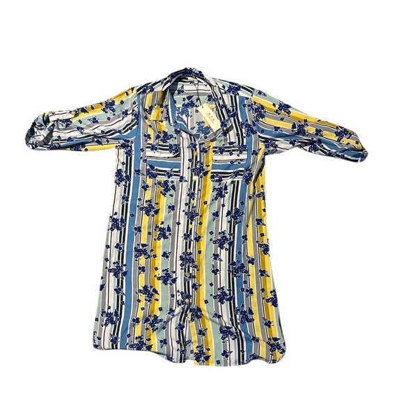 NWT, MPH Collection Button down top, Collar, Gold Buttons, XL, Rolled Sleeves, Slits in hem, Navy Blue Flowers, Stripes