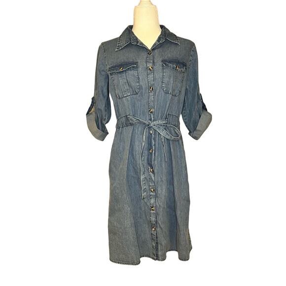 NWT MPH Collection Denim Chambray Roll Tab Sleeves Belted Dress Women’s Medium