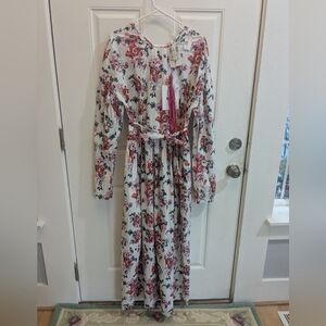 Elegant floral maxi dress with long sleeves. Features a vibrant floral pattern on a white background. Includes a matching belt for a flattering fit.