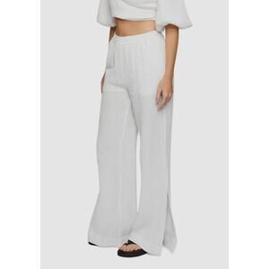 Embry Gauze Coverup Pant in White. Full length swim coverup pants boasting a relaxed fit, wide leg silhouette with side slit cutout. Crafted from lightweight cotton gauze with a elasticized waistband and front pockets.