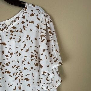 NWT MTS Angela Ivory/Dark Caramel Abstract Print Short Sleeve Pullover Lightweight Top with Keyhole Upper Back; Pleated/Gathered Shoulder Seams and Front Neckline; Size Large; When lying flat, measures 21" pit to pit and 25" in length from back center neckline to bottom hem; Fabric and Care instructions shown in pictures.