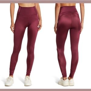 A stylish high waist cut legging features a shiny stretch construction, perfect for a stylish workout look.