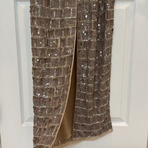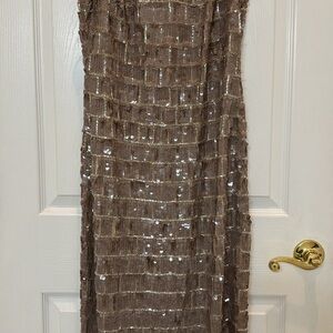 NWT Mac Duggal 10907 Sequined High Neck Sleeveless Column Gown in Taupe Size 12.