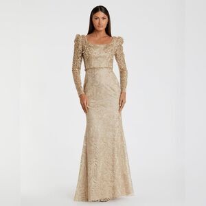 NWT Mac Duggal 11187 Gold Embroidered Lace Applique Shoulder Detail Trumpet Gown