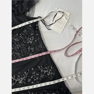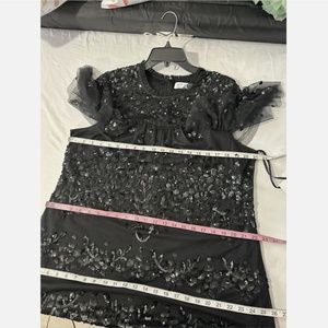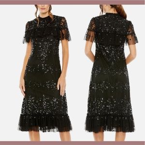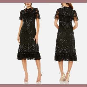 NWT Mac Duggal [ 14 ] Sequined High Neck Ruffled Flutter Sleeve Midi Dress Black