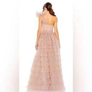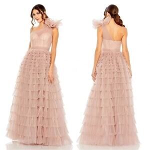 NWT Mac Duggal 20447 One Shoulder Bow Feather Tiered A-Line Gown $798 Sz 10 ROSE
