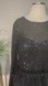 Chic tea-length dress with a sequined bodice, long sleeves, and a round neckline. A-line skirt features black layered tulle, and hand-beaded belt accents the natural waist.
