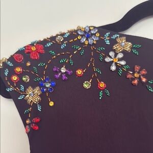 This stunning dress features a fitted silhouette that beautifully accentuates the figure, complemented by a plunging V-neckline for a dramatic effect. The sleeveless design enhances its elegance, while the vibrant red embellishments add a striking contrast against the black fabric, making it perfect for cocktail occasions.