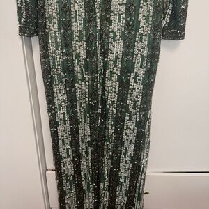 This stunning Mac Duggal gown features a captivating sage and silver color palette with a heavily embellished sequined texture. The long bishop sleeves and crew neck add an elegant touch, making it perfect for cocktail occasions. Its floor-length design ensures a glamorous silhouette that is sure to turn heads.