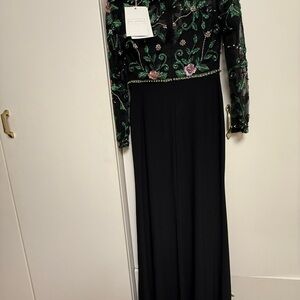 This stunning gown features a floor-length design with intricate embellishments and a chic slit. The long sleeves and crew neck add elegance, while the striking black and green colors make it perfect for a wedding guest or prom.