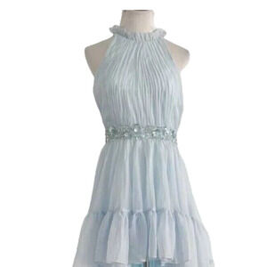 The bright chiffon dress highlights your legs with a high hemline before falling into a sweeping train at the back. A pleated halter bodice with petite ruffle trim and a scintillating embellished waist make it extra special.