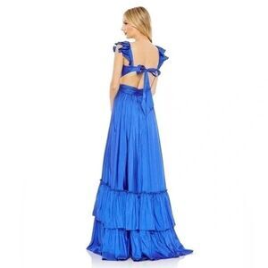 NWT Mac Duggal 68062 Satin Tie-Back Cut-Out Tiered Maxi Dress Blue Size 8