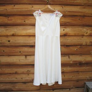 Chic tea-length dress with beaded floral shoulders, cap sleeves, a v-neckline, and a thigh high slit.
