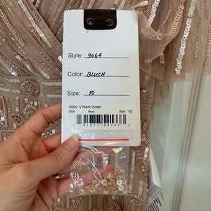 Given the delicate nature of MD dresses, there is always the possibility of loose threads or missing sequins/beads. Each dress comes with an extra bag of embellishments for any minor repairs or touch-ups that may be needed.