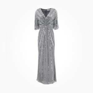 Elevate your evening look with our Sequined V Neck Cape Sleeve Gown. The sophisticated silhouette flatters your figure, while the v-neckline adds a touch of elegance. The short flutter sleeves provide the perfect balance of coverage and comfort. Perfect for any special occasion. SRP $698
