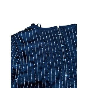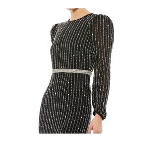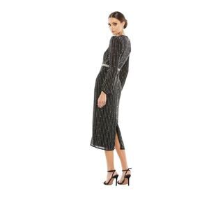 Designed with long puff-sleeves, this Mac Duggal midi-dress is styled with beaded pinstripe embroidery.