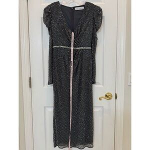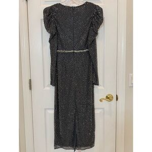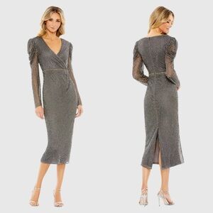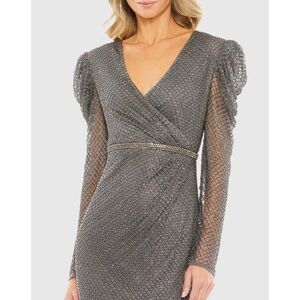NWT Mac Duggal 93674 Gray Beaded Wrap Over Puff Sleeve Dress Size 4.